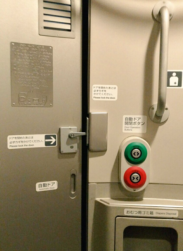 تويتر 波子 على تويتر 新幹線車内の多目的トイレは自動ドアだけど 室内に入ったら手で施錠する 一般的な多目的トイレの自動ドア は内側の 閉 ボタンを押すと自動的に施錠されるから ついそのつもりで忘れちゃいそうになる 車いすでみるなら T Co